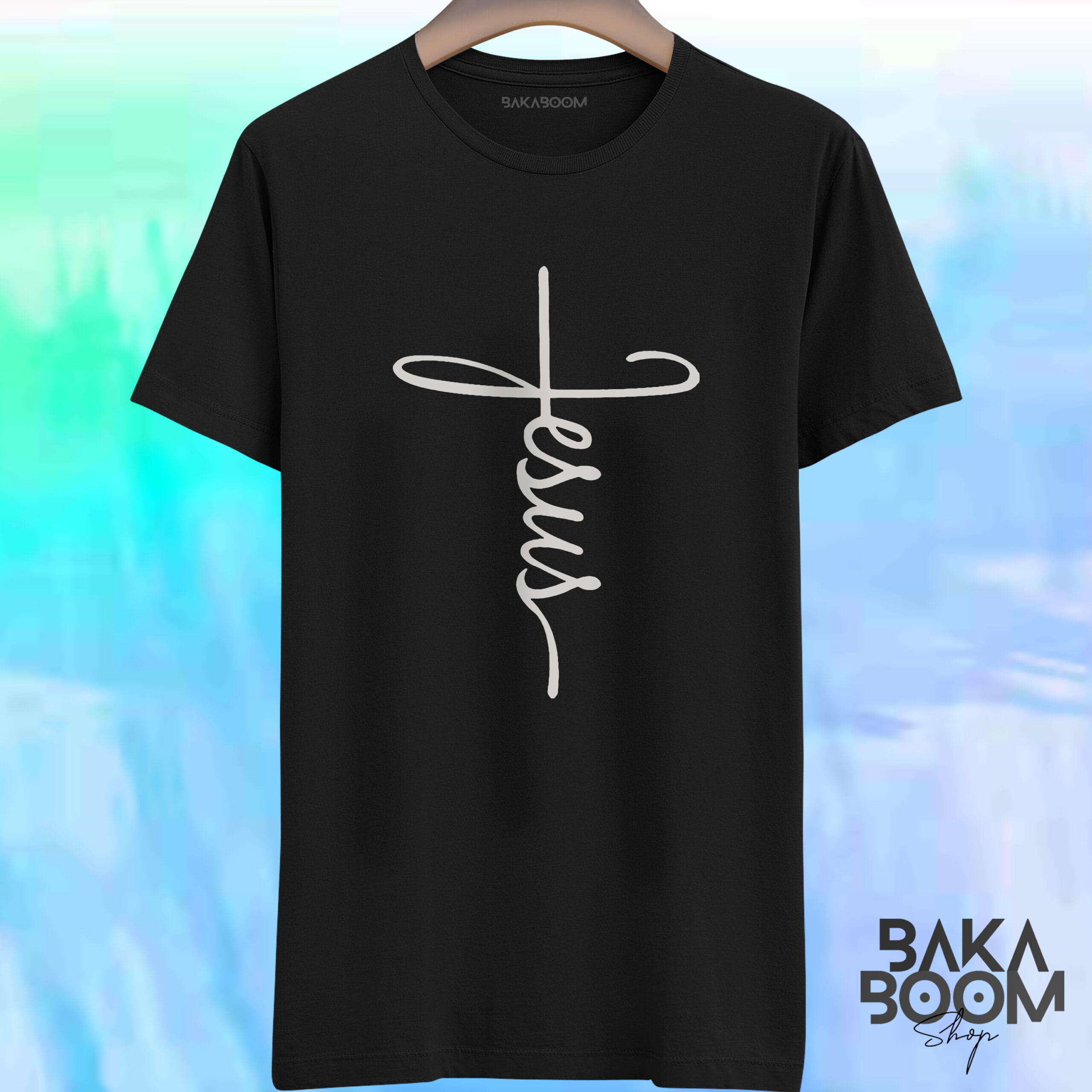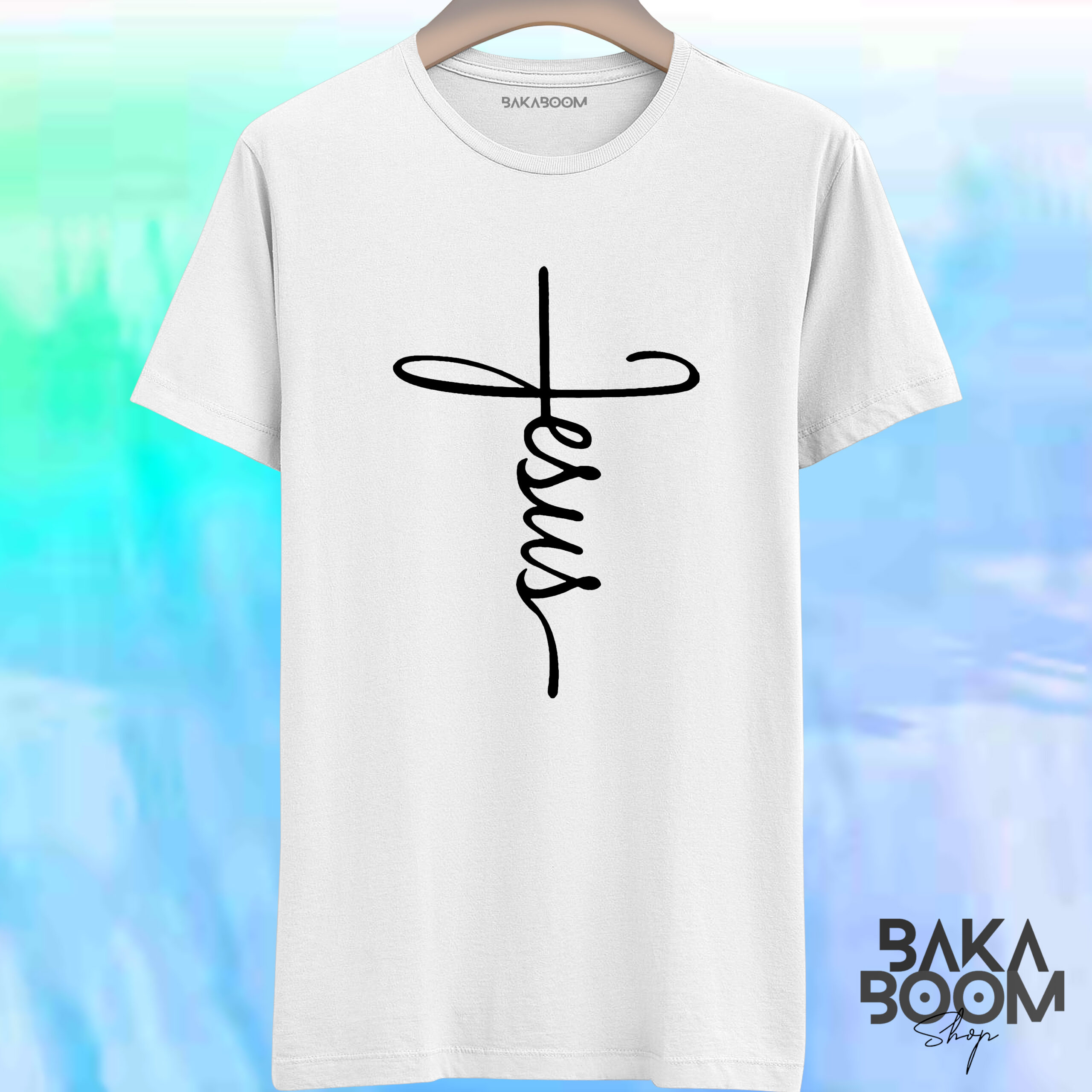 Camiseta Cristiana con mensaje reivindicativo donde la palabra Jesús hace de cruz, diseño sencillo y bonito.
