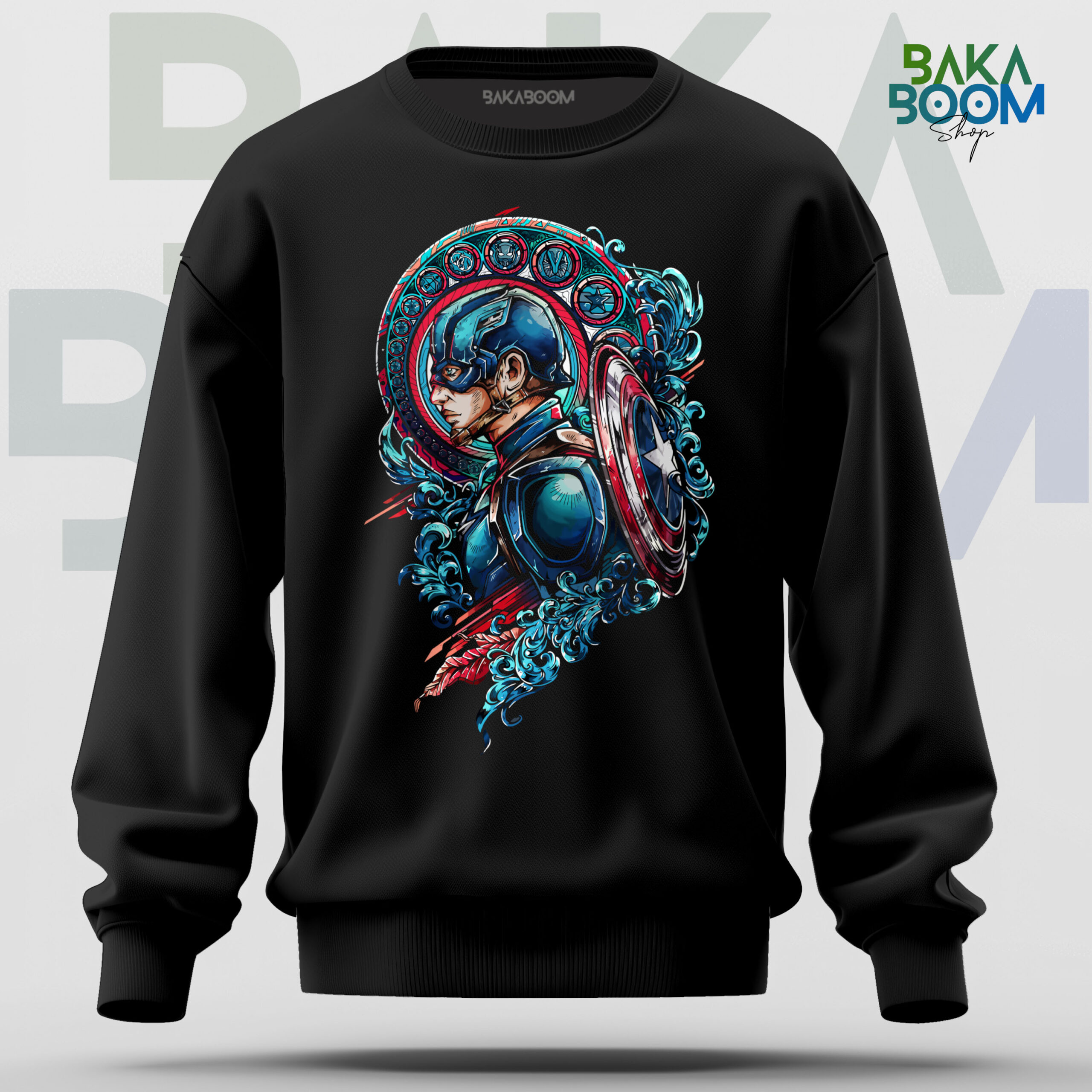 SUDADERA CAPITAN AMERICA, Estilo clásico con puños y cinturilla con punto canalé 1×1 con elastano. Material: 50% algodón / 50% poliéster, felpa perchada, 280 g/m².