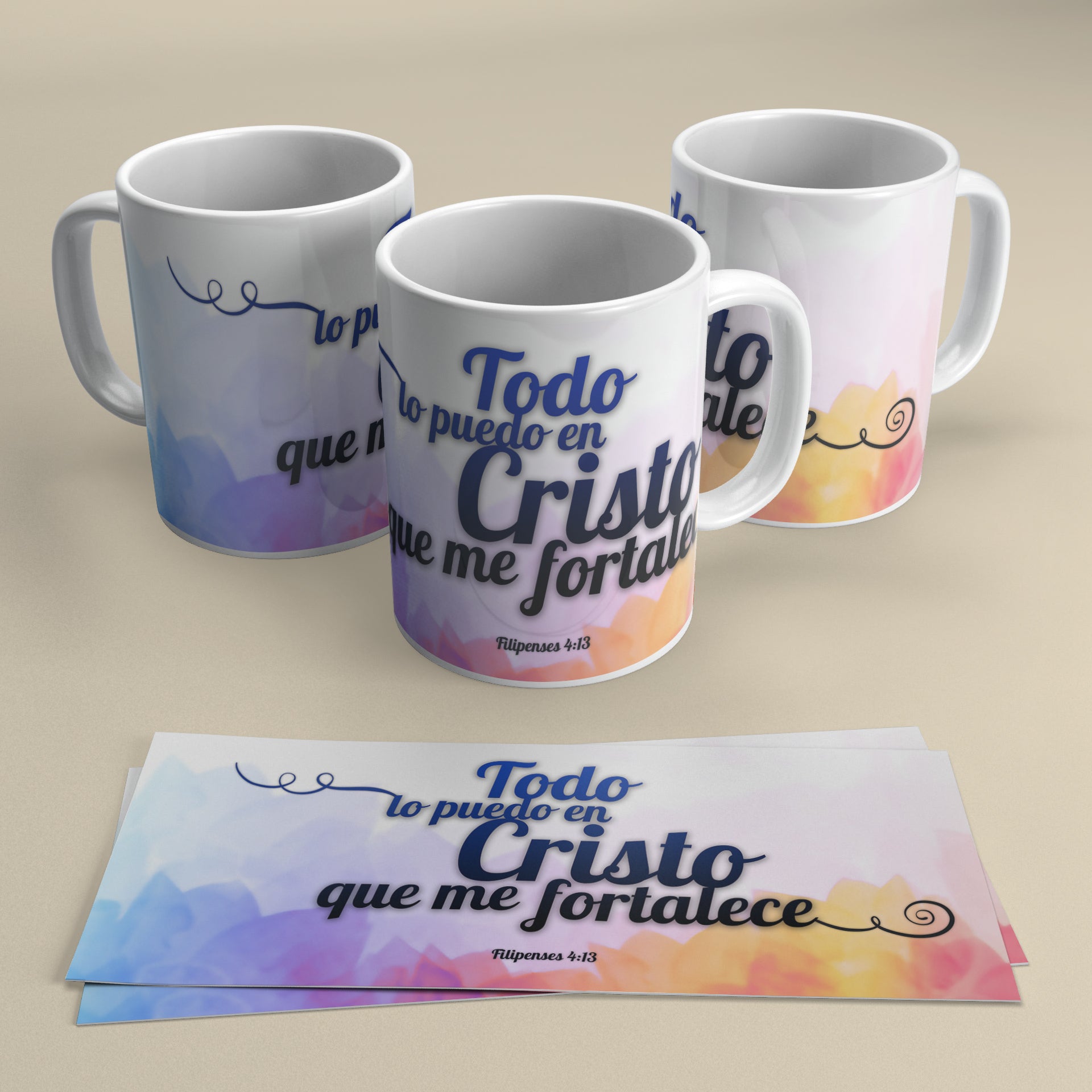 Taza Cristiana Todo lo puedo,  en brillo de calidad triple AAA, con diseño en alta definición y colores vivos. Capacidad de 350 Ml. Apta para lavavajillas y Micro.